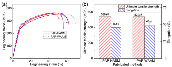 The mechanical properties of 316 L samples fabricated by PAP-HASM and PAP-WAAM. (a) Engineering stress–strain curves; (b) ultimate tensile strength and elongation.