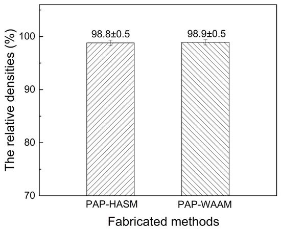 Figure 8 shows a representative fracture surface of the parts fabricated by PAP-HASM and PAP-WAAM. A number of dimple-like structures are observed on the fracture surfaces of both the PAP-HASM and PAP-WAAM specimens, which means that the specimens exhibit ductile fracture. The dimple morphologies can reflect the mechanical properties of the specimen. Evidently, the dimple morphology is almost identical on the fracture surface of both the PAP-HASM and PAP-WAAM components, indicating similar mechanical properties. The tensile properties shown in Figure 7 are consistent with the observed fracture surfaces, as shown in Figure 8. In addition, the relative density of the specimens fabricated by PAP-HASM and PAP-WAAM is shown in Figure 9. PAP-HASM and PAP-WAAM can produce nearly full dense 316 L components with a relative density ≥98.8%.