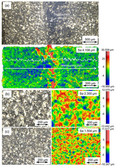 As shown in Figure 2d, some debris are reattached on the side of the part after dry EDM milling with the 1st finishing parameters. The debris is uniformly distributed along the scanning path of the dry EDM milling; this phenomenon may be due to some molten material that was expelled from the molten pool and which was not completely cooled when it reached the surface of the workpiece, forming debris reattached to the machined surface. The reattached debris is uniformly produced along the scanning path as the electrode moves. The surface morphology of the corresponding area is shown in Figure 10a. The reattached debris exhibits a black color. A relatively convex morphology can be observed in the area of the reattached debris, which leads to a reduction in the surface quality. The surface arithmetic means deviation (Sa) of the area where the reattached debris is located is 4.108 μm.