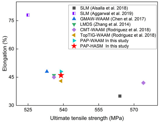 Figure 7a shows the engineering stress-strain curves of the tensile specimens fabricated by PAP-HASM and PAP-WAAM. The corresponding ultimate tensile strength and elongation are shown in Figure 7b. The mean ultimate tensile strength and elongation of the PAP-HASM specimens are 539 ± 8 MPa and 46 ± 4%, respectively. The PAP-WAAM specimens exhibit similar ultimate tensile strength and elongation, with a mean ultimate tensile strength of 539 ± 5 MPa and a mean elongation of 48 ± 4%. The PAP-HASM components exhibit excellent tensile properties along the vertical direction, which are comparable to those of the PAP-WAAM components. This indicates that dry EDM milling did not cause adverse effects on the mechanical properties of the PAP-HASM components. Similarly, this phenomenon may be due to the recast layer on the part surface being very thin due to the large amount of molten material removed by the assist gas [24,25]. Dry EDM milling is performed to mill the top surface of the as-fabricated component with a height of approximately 9 mm. The recast layer has a very small proportion of the volume of the deposited structure. In addition, the recast layer is not 100% oxygen, and it is not possible to dilute all the material in the recast layer into the melt pool as some percentage of the material may vaporize. Thus, potential dissolution of the recast layer during PAP-HASM did not have a significant adverse effect on the mechanical properties of the as-fabricated parts. Similar analyses have been reported in the published literature [28].