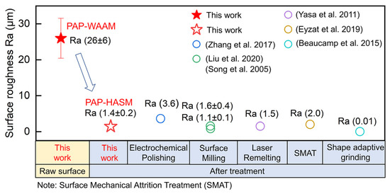 The experimental results obtained in this study are compared with those published in the relevant references. Figure 11 shows the comparison of mechanical properties, and Figure 12 shows the comparison of surface roughness. Because the mechanical properties of as-fabricated parts are determined by the forming methods and numerous processing parameters, a wide range of mechanical properties have been published in the references, with ultimate tensile strength ranging from 525 to 574 MPa and elongation ranging from 35% to 78%. The mechanical properties of components fabricated by PAP-HASM also fall in this range. This indicates that the PAP-HASM developed in this study can be used as an effective method to fabricate nearly full-dense metal parts with excellent mechanical properties. Figure 12 shows that the surface roughness of as-fabricated parts can be reduced to a Ra of 1.4 ± 0.2 μm after dry EDM milling with the 3rd finishing parameter. The surface roughness can be further reduced by reducing the discharge energy. This value is comparable to that resulting from commonly used post-treatment techniques, such as surface milling, laser remelting and surface mechanical attrition treatment, which is better than electrochemical polishing but inferior to shape adaptive grinding, indicating that the surface quality of PAP-HASM components can meet the demands of most engineering applications.