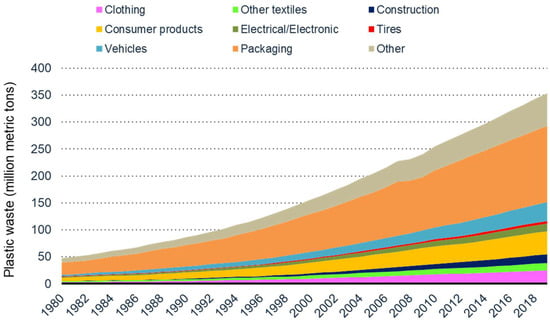 Figure 3 illustrates different industrial sectors contributing to the generation of plastic waste [21]. The packaging industries are the largest consumers of all plastics produced globally in the form of single-use plastics, a majority of which end up in landfills. According to recent estimates, approximately 75–200 million tons of plastic have ended up in our oceans [20], including 5.25 trillion pieces of plastic debris [22]. It is also reported that nearly 269,000 tons of plastics float on the ocean surface, whereas over 4 billion/km2 of microplastic fibers can be found in the deep sea [22]. Figure 4 depicts the fractions of end-of-life plastics treated by waste management facilities in different OECD (Organization for Economic Co-operation and Development) and non-OECD countries [19].