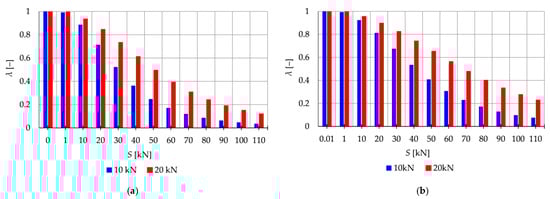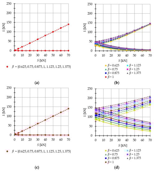 For the Simplex module (Figure 9a–c and Figure 10a), at lower values of prestressing forces , the parameter ranges from 1.0 to 0.36 for and from 1.0 to 0.61 for . This means that at , the instability region is only 64% and 39% smaller, respectively, than the area of the instability region at zero initial prestress. However, further prestressing considerably narrows the instability regions, and at the maximum level, ranges from 0.03 to 0.12, resulting in a decrease of the instability region by 97% and 88%.