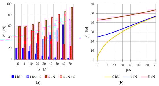 Impact of the initial prestress level S on: (a) the axial force , (b) the first natural , and free frequencies , .
