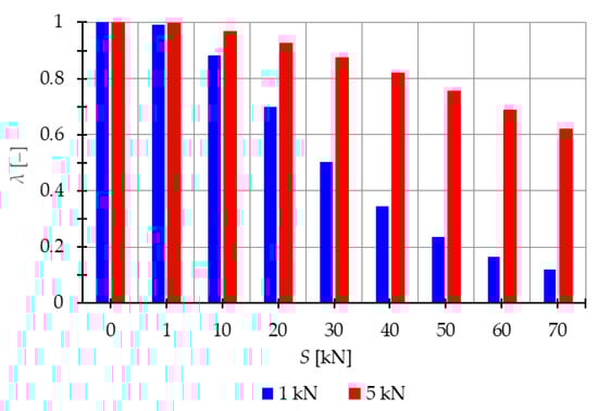 In both modules, the external load prestresses the structure. However, after introducing the initial prestress, the normal forces resulting from the external load progressively decrease, reducing their influence on the frequency. Figure 8 visualizes the change in the value of normal forces caused by the load and the normal forces generated by the combined action of the load and prestress .