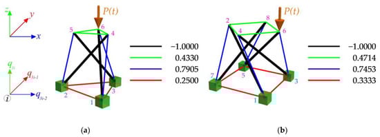 The first considered tensegrity structures are the single modified Simplex (Figure 6a) and Quartex (Figure 6b) modules. In these structures, all degrees of freedom (DoF) of the bottom nodes are fixed. For the Simplex module, nine DoFs are fixed, while for the Quartex module, twelve DoFs are fixed. Both modules are characterized by having one infinitesimal mechanism [1]. The modules are subjected to the periodic load , which is applied to the 6th node (Figure 6). Two variants of the constant part of the periodic force are considered, i.e., and .
