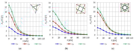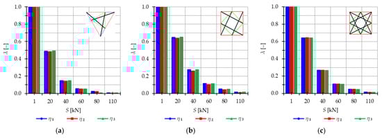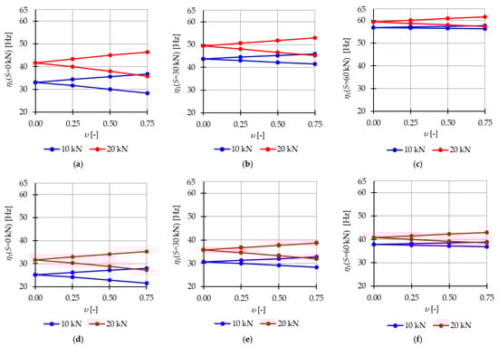 The nondimensional parameter (18) is calculated to measure the changes in the area of the instability regions, as shown in Figure 17. Similar to the previous example, as the level of initial prestress S increases, the resonant frequencies increase while the range of the instability areas decreases. This trend is consistent across all cases. At low values of initial prestressing forces, the range of the three main instability ranges changes slightly. For example, at , the parameter is equal for the Simplex tower and for the Quartex towers. This means that the instability regions are, respectively, and 16% smaller than the regions at the minimum level of initial prestress ). However, further prestress significantly narrows the instability regions. At , and (the regions decrease by ), and at the maximum level— (the region decreases by ). This indicates that the boundaries of instability regions practically coincide at high initial prestress levels.