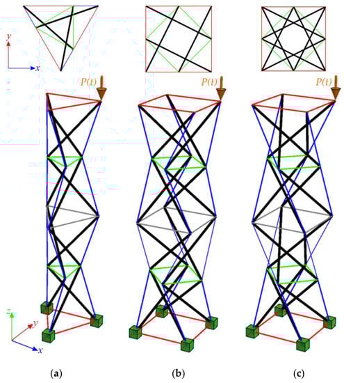 The analysis focuses next on structures built with linearly connected modules, referred to as towers. The Simplex modules can only be connected in one way (Figure 11a), while the Quartex modules can be connected in two ways (Figure 11b,c). The connection method for Quartex modules is important, as confirmed in Part 1. In the analysis of Quartex modules, two types of connections are considered: connection A and connection B. Connection A involves overlapping the struts in a plan view. This means that the struts intersect and overlap each other in the structure, creating a configuration where the struts cross each other at certain points. On the other hand, connection B is characterized by a star-like pattern formed by the struts. In this configuration, the struts radiate from a central point and do not intersect or overlap each other. In the previous part, an abnormality in the dynamic behavior of Quartex towers was observed. The number of natural frequencies, depending on the prestressing, should be equal to the number of infinitesimal mechanisms. This principle holds true for Simplex towers. However, in the case of Quartex towers constructed with four or more modules, there is an additional frequency that depends on the initial prestress. This frequency is non-zero in the absence of initial prestress and its value varies with the change in prestress. Therefore, the analysis considers structures built with three (S3, Q3-A, Q3-B) and four (S4, Q4-A, Q4-B) modules. Similar to previous cases, all degrees of freedom of the bottom nodes are fixed, resulting in nine fixed degrees of freedom for Simplex structures and twelve fixed degrees of freedom for Quartex structures. The structures are characterized by three and four infinitesimal mechanisms for structures built with three and four modules, respectively. The structures are loaded with the periodic load applied to one of the upper nodes. In this analysis, the constant part of the periodic force is set as .