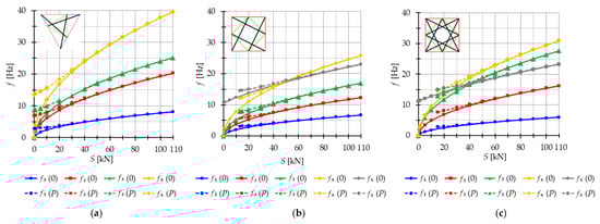 The analysis focuses next on three-module tensegrity towers, specifically the S3, Q3-A, and Q3-B structures. The minimum level of self-stress for all towers is equal to . These towers are characterized by three infinitesimal mechanisms [1] and behave typically as structures characterized by infinitesimal mechanisms, i.e., the number of natural frequencies depending on the prestressing is equal to the number of infinitesimal mechanisms. In the absence of initial prestress , the natural frequencies are zero, and their values vary with the change in prestress. The impact of initial prestress on the natural frequencies is shown in Figure 12. The values of the three natural frequencies vary within the range of