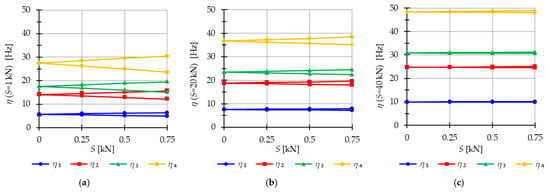 Impact of the initial prestress level S on the natural and free frequencies : (a) S4, (b) Q4-A, (c) Q4-B.