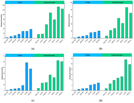 After obtaining the complex modulus and phase angel of bitumen, the rutting factor of bitumen was obtained, which is proven to correlate well with the high-temperature performance of bitumen. Figure 3 presents the rutting factor of bitumen before and after aging. As can be seen from the figure, the application of plastic improves the rutting factor of bitumen at different temperatures, and the increase in the rutting factor is more pronounced as the content of plastic increases, indicating the addition of plastic improves the high-temperature rutting resistance of bitumen. In addition, the addition of SBR does not lessen the improvement of the plastic on the high-temperature performance of the bitumen. On the contrary, the addition of SBR further improves the high-temperature performance of waste plastic-modified bitumen. After long-term aging, the rutting factor of bitumen increases obviously with the highest rutting factor of 7.5-PAV, indicating the temperature performance enhancement after bitumen long-term aging. It applies to all base bitumen, plastic-modified bitumen and plastic/SBR composite-modified bitumen.