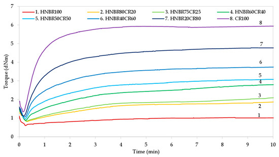 The minimal rheometric torque (Tmin) indicates the viscosity of the uncured HNBR/CR blends. Table 2 shows that the CR100 sample had the highest viscosity, which was confirmed by the largest minimal torque, equal to 1.35 d∙Nm. In the case of the HNBR100 mix, the lowest viscosity and minimal torque (Tm = 0.68 d∙Nm) were observed. This is due to the chemical structure of these elastomers, because the content of the chlorine groups in chloroprene rubber indicates stiffness of the polymer chains and, consequently, higher viscosity. Thus, the value of minimal torque decreases with the increasing content of hydrogenated acrylonitrile-butadiene rubber. The susceptibility of CR to crystallization is also of great importance. Chloroprene rubber is one of the elastomers that can crystallize under the influence of low temperature or as a result of orientation brought about by stretching in conditions of moderate or considerable deformation, with the formation of a crystalline phase [37]. This physical behavior of the chloroprene rubber can result in higher viscosity mixes containing a higher amount of this rubber, but problems can arise when processing such elastomeric compositions.
