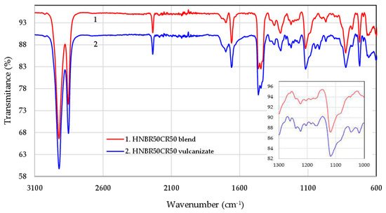 Attenuated Total Reflectance Fourier-Transform Infrared (ATR-FTIR) spectroscopy was used to explain the structure of HNBR/CR blends before and after their cross-linking in the presence of silver(I) oxide. The infrared spectra confirm that Ag2O is an effective curing agent of HNBR/CR composites. The FTIR spectra of the selected HNBR/CR (50/50 by wt.) composite are shown in Figure 2.