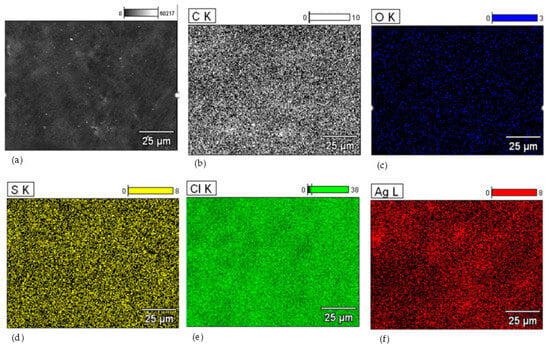 The distribution of elements in selected micro-areas of the HNBR50CR50 vulcanizate: surface morphology (a); distribution of carbon atoms (b); distribution of oxygen atoms (c); distribution of sulfur atoms (d); distribution of chlorine atoms (e); distribution of silver atoms (f); K—electron K shell; L—electron L shell.