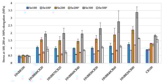 Comparison of stress at elongation at 100%, 200%, and 300% of HNBR/CR/Ag2O vulcanizates before and after thermo-oxidative aging process; Se100, Se200, and Se300—stress at elongation of 100%, 200%, and 300%, respectively; Se100*, Se200*, and Se300*—stress at elongation of 100%, 200%, and 300%, respectively, after termo-oxidative aging.