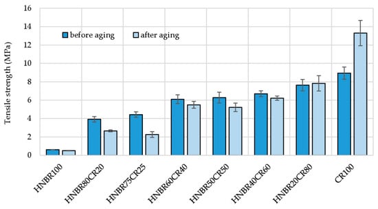 The HNBR100, HNBR40CR60, and HNBR20CR80 vulcanizates showed little change in tensile strength under thermo-oxidative aging. The cross-linked HNBR75CR25 compound showed the greatest decrease in tensile strength, equal to almost half of the value determined before aging (TSb = 4.43 MPa, and TSb* = 2.26 MPa). The tensile strength for the HNBR20CR80 vulcanizate increased from 7.63 MPa to 7.83 Mpa, indicating the high resistance of this product to thermo-oxidative aging. Surprisingly, for the CR100 vulcanizate, a clear improvement in tensile properties was observed after aging. The TSb value of CR cured with Ag2O was 8.93 MPa, and after exposure to high temperature for 7 days the CR100 vulcanizate showed a 50% increase in tensile strength (TSb* = 13.3 MPa). This is probably due to the use of silver(I) oxide as a cross-linking agent and the extra curing phenomenon (Table 5 and Figure 8).