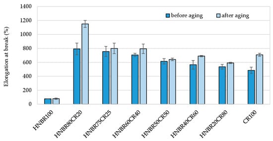 The elongation at break (Eb*) of all vulcanizates subjected to thermo-oxidative degradation increased, though only slightly for the HNBR50CR50 vulcanizate (Eb = 616%, and Eb* = 642%). The greatest increase in elasticity after aging factors was evident for the HNBR80CR20 vulcanizate, which had a higher deformation capacity (Eb = 792%, and Eb* = 1151%) than the other vulcanizates (Table 5 and Figure 9).
