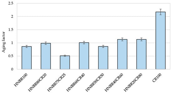Both HNBR and CR are elastomers categorized as aging-resistant materials. For this reason, their vulcanizates could also be expected to show similar properties. The calculated aging factor (AF) values for most vulcanized materials oscillate around 1, which confirms high thermo-oxidative resistance (Table 5 and Figure 10). Only the HNBR75CR25 vulcanizate, with an AF value of 0.54, proved to be susceptible to aging processes, resulting in a significant deterioration of its strength properties. The CR100 vulcanizate showed the greatest resistance to thermo-oxidative degradation processes. In this case, the calculated aging factor was as high as 2.17. However, it can only be speculated that this cross-linking with Ag2O allowed the mechanical properties of pure CR to double under aging process. Among the cured blends, the highest AF parameter (1.13) was achieved by the HNBR20CR80 and HNBR40CR60 vulcanizates.