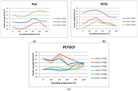 - Annealing temperature has an effect on the tensile strength of different materials. However, the specific range of temperatures that leads to an increase in tensile strength varies depending on the material. While PLA and PETG showed an increase in tensile strength at specific temperature ranges (PLA at 80 °C and 90 °C, and PETG at 60 °C and 70 °C); however, the effect of annealing temperature on PETGCF was not as clear. Therefore, it is crucial to carefully adjust the annealing temperature for each material to achieve the desired improvement in tensile strength. For PLA, average tensile strength for all combinations at 80 °C being 30.54 N/mm2, and for 90 °C being 30.57 N/mm2, compared to lower temperatures where for 60 °C and 70 °C, average tensile strengths were 29.49 N/mm2 and 29.33 N/mm2, respectively. PETG at temperatures of 60 °C or 70 °C gives the best results, as average tensile strength for all combinations was 31.41 N/mm2 and 32.1 N/mm2, respectively, compared to higher temperatures of 90 °C and 100 °C, where average tensile strengths were 30.73 N/mm2 and 30.29 N/mm2. PETGCF is highly dependent on layer height. For LH of 0.1 mm, the best average tensile strength (of 32.31 N/mm2) is at temperatures of 60 °C, compared to other temperatures, that do not go over 29 N/mm2. For LH of 0.2 mm, temperature of 70 °C shows the best results with average tensile strength of 25.93 N/mm2, with all others being around or below 24 N/mm2. Additionally, for LH of 0.3 mm, temperature of 100 °C has average tensile strength of 23.39 N/mm2, with all others being around 22 N/mm2. So, for PETGCF it is important to use an appropriate combination of layer height and annealing temperature, as annealing temperature causes the material different effects in different layer heights.