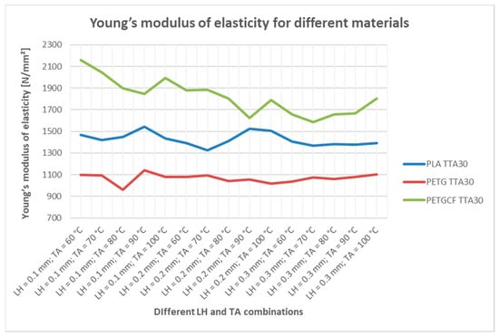 - For modulus of elasticity, one overall trend that was noticed is that PETGCF has the highest modulus of elasticity across all combinations, then PLA, and lastly PETG. The study found that annealing PLA at 100 °C for 90 min after printing with a 0.2 mm layer height led to a significant improvement in modulus of elasticity, with a 12.73% increase compared to the base specimen (from 1392.99 MPa to 1570.38 MPa). Similarly, for PETG, annealing at 90 °C for 30 min after printing with a 0.1 mm layer height, and at 70 °C for 30 min after printing with a 0.2 mm layer height, resulted in approximately a 5% increase in modulus of elasticity (from 1083.83 MPa to 1140.8 MPa and from 1039.48 MPa to 1094.99 MPa, respectively). Lastly, for PETGCF, annealing at 100 °C for 90 min after printing with a 0.2 mm layer height led to a significant 21% increase in tensile strength compared to the base specimen (from 1710.96 MPa to 2072.48 MPa).