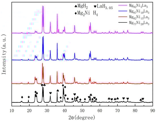 Figure 2 shows the XRD patterns of Mg77+xNi20−xLa3 (x = 0, 5, 10, 15) alloys after saturated hydrogenation. It can be seen from the figure that the main phases of Mg77Ni20La3 alloy after saturated hydrogenation are Mg2NiH4, MgH2 and LaH3.05, which are manifested as peaks with different positions and intensities on the XRD pattern. As the Mg content increases and the Ni content decreases, the intensity of the Mg2NiH4 phase diffraction peak gradually decreases, while the intensities of the MgH2 and LaH3.05 phase diffraction peaks increase significantly. This indicates that the La2Mg17 and La2Mg17 phases before hydrogenation of the alloy are completely transformed into LaH3.05 and MgH2 phases, and no unmelted Mg and Ni elements are generated.