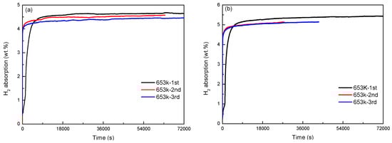Long-time activation curves of Mg77+xNi20−xLa3 (x = 0, 5) alloys at 653 K: (a) long-time hydrogen absorption by Mg77Ni20La3; (b) long-time hydrogen absorption by Mg82Ni15La3.
