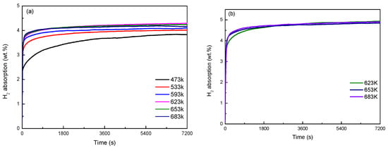Figure 6 shows the hydrogen absorption kinetics curves of Mg77+xNi20−xLa3 (x = 0, 5) alloy at different temperatures. As shown in Figure 6a, the hydrogen absorption of Mg77Ni20La3 alloy reaches 4.02 wt.% at 533 K for 2 h, and the hydrogen absorption kinetics curves of Mg77Ni20La3 alloy are almost identical when the temperature is above 533 K, indicating excellent hydrogen absorption kinetics properties. The hydrogen absorption at 623 K and 683 K are 4.3 wt.% and 4.16 wt.%, respectively. Figure 6b reveals that the hydrogen absorption of Mg82Ni15La3 alloy attains as high as 4.92 wt.% at 683 K for 2 h. This is because the higher the Mg content, the stronger the hydrogen absorption ability of the alloy. The hydrogen absorption amount of the initial activation curve in Mg77Ni20La3 and Mg82Ni15La3 alloys is significantly higher than that of the alloy at each temperature, which is due to the formation of LaH3.05 phase with high thermal stability and difficult to decompose after the initial hydrogenation of the alloy. In summary, Mg82Ni15La3 alloy has better hydrogen absorption kinetics performance than Mg77Ni20La3 alloy.