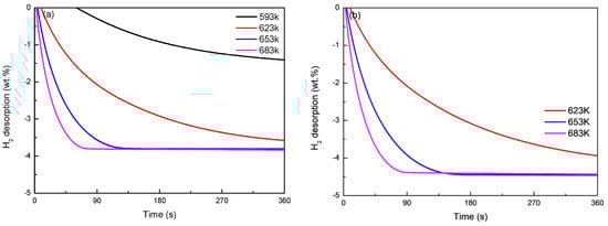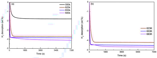 Figure 7 and Figure 8 show the hydrogen desorption endothermic reaction kinetics curves of Mg77+xNi20−xLa3 (x = 0, 5) alloys at different temperatures. It can be seen from Figure 7a that Mg77Ni20La3 alloy has the best hydrogen desorption working temperature above 623 K and reaches a hydrogen desorption amount of 4.1 wt.% at 683 K. It can be seen from Figure 7b that Mg82Ni15La3 alloy has a hydrogen desorption amount of up to 4.69 wt.% at 683 K. This is because the higher the Mg content, the stronger the hydrogen desorption ability of the alloy. It can be seen from Figure 8a that the short-term hydrogen desorption endothermic kinetics curve of Mg77Ni20La3 alloy shows that the maximum hydrogen desorption amount of the alloy is 3.8 wt.% at 653 K and reaches the saturated hydrogen desorption amount within 125 s. As the temperature increases, it only takes 71 s to reach a maximum hydrogen desorption amount of 3.8 wt.% at 683 K. This is mainly due to the increase of temperature, which increases the energy of reactants in the alloy, accelerates the hydrogen desorption rate of the alloy, and thus increases the hydrogen desorption amount. At the same time, Figure 8b shows that the short-term hydrogen desorption exothermic kinetics curve of Mg82Ni15La3 alloy shows that the alloy reaches a saturated hydrogen desorption amount of 4.39 wt.% within 140 s at 653 K. And when the temperature rises to 683 K, Mg82Ni15La3 alloy reaches a hydrogen desorption amount of 3.8 wt.% within 47 s.
