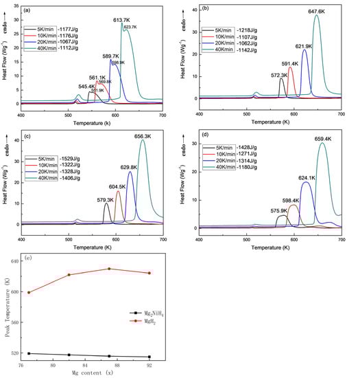 DSC curves of saturated hydrides of Mg77+xNi20−xLa3 (x = 0, 5, 10, 15) alloys: (a) Mg77Ni20La3; (b) Mg82Ni15La3; (c) Mg87Ni10La3; (d) Mg92Ni5La3; (e) two peak heat absorption temperatures with increase of Mg content at 20 K/min heating rate contention.