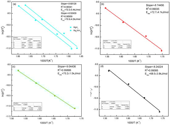 Kissinger plot corresponding peak temperature of DSC at different heating rates of Mg77+xNi20−xLa3 (x = 0, 5, 10, 15) alloys: (a) Mg77Ni20La3; (b) Mg82Ni15La3; (c) Mg87Ni10La3; (d) Mg92Ni5La3.