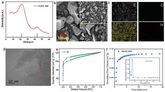 The porous carbon derived from grapefruit peel (denoted as NSOC-800) was synthesized by a facile one-step KOH activation method without extra dopants. Specifically, the homogeneous mixture of grapefruit peel and KOH was annealed in N2 atmosphere, and then the KOH was cleaned by the deionized water. The chemical composition and structural characteristics were firstly analyzed by X-ray diffractometry (XRD). As illustrated in Figure 1a, the XRD pattern of the NSOC-800 sample displays two typical peaks at around 23° and 43°, ascribed to the graphitic stacking of (002) and the reflections of the overlapped (100) and (101) faces, correspondingly, which demonstrates that the obtained NSOC-800 sample is a crystalline carbon material [43]. The scanning electron microscopy (SEM) images of the NSOC-800 sample in Figure 1b shows glossy morphology with various sizes. The elemental distribution in the NSOC-800 sample was analyzed by energy-dispersive spectroscopy (EDS) elemental mapping. Figure 1c reveals the presence of C, S, O and N elements in the sample, whose weight proportions are 79.34%, 11.72%, 7.50% and 1.44%, correspondingly. As shown in Figure 1d, the high-resolution transmission electron microscopy (TEM) image displays numerous micropores in the obtained sample, demonstrating its well-developed porosity characteristic. Moreover, the nitrogen adsorption–desorption isotherms of the NSOC-800 sample are revealed in Figure 1e, showing the NSOC-800 sample with a Brunauer–Emmett–Teller (BET) surface of 1267.913 m2/g. Additionally, the obtained NSOC-800 sample exhibits micropores of 0.6–2.0 nm diameter and the total volume of 0.189 cm3/g, which are favorable for enhancing energy storage (Figure 1f).
