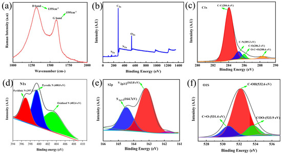 The Raman spectra were collected to analyze the graphitization degree of carbon materials in Figure 2a. The characteristic Raman peaks observed at 1350 cm−1 and 1590 cm−1 are attributed to the D-band (the defect disordered frameworks) and G-band (hybridized carbon architecture (sp2)). The relative intensity ratio of the D- and G-bands (denoted as ID/IG) are negatively correlated with the degree of graphitization. Therefore, the NSOC-800 sample has a comparatively higher ID/IG value (1.31), which illustrates that the NSOC-800 derived from grapefruit peel under alkaline conditions endows highly disordered carbon frameworks with abundant defect sites [44]. Furthermore, X-ray photoelectron spectroscopy (XPS) was performed to detect the chemical composition of the obtained sample. The XPS survey of the NSOC-800 sample in Figure 2b shows four elements’ (C, S, N and O) signals, preliminarily notarizing the successful doping of S, N and O in the carbon framework. The high-resolution C 1s spectrum of the NSOC-800 sample, Figure 2c, displays some spin–orbit doublet peaks at 284.4, 285.2, 286.3 and 288.6 eV assigned to C-C, C-N/C-S, C-O and O-C=O. As shown in Figure 2d, the N 1s spectrum reveals three characteristic peaks indexed to the pyridinic-N (397.2 eV), pyrrolic-N (400.0 eV) and graphitic-N (402.6 eV). And, the S 2p spectrum (Figure 2e) shows two peaks at 163.8 and 164.7 eV, which are identical to S 2p3/2 and S 2p1/2 peaks [45]. Moreover, the two main signal peaks in the high-resolution O 1s spectrum (Figure 2f) suggest the existence of C=O (531.4 eV), C-OH (532.6 eV) and O=C-O (533.9 eV) [42]. The dopant of N, S and O are favorable for the formation of disordered carbon frameworks with abundant defect sites, which corresponds to the Raman results.