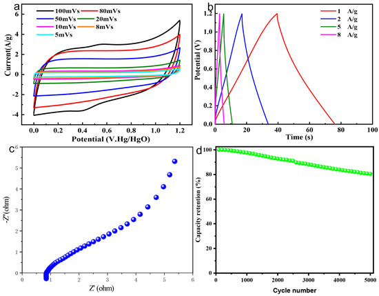 To better elucidate the remarkable electrochemical properties of the NSOC-800 electrode, electrochemical impedance spectroscopy (EIS) was carried out in Figure 3c. The Nyquist plot obtained from the EIS includes a semicircle in the high-frequency region and a line with a slope in the low-frequency region, which is related to the charge-transfer resistance and the diffusion-limited electron transfer process [47]. Encouragingly, the NSOC-800 exhibits low charge-transfer resistance (0.58 Ω) and a large slope, confirming that the NSOC-800 with the N, S, O self-doping shows excellent conductivity and ion diffusion rate, which are conducive to the NSOC-800 having an outstanding electrochemical performance. Moreover, the cycling durability is an important performance parameter for electrochemical energy storage devices, and was examined by a GCD test at the current density of 1 A/g. As indicated in Figure 3d, the NSOC-800 presents appealing lifespan with 90.1% capacitance retention after 5000 cycles, demonstrating the potential for practical application.
