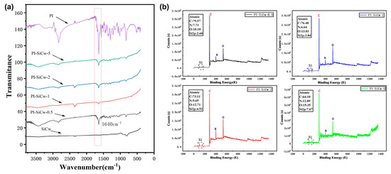 An X-ray photoelectron spectroscopy (XPS) test was performed on an X-ray photoelectron spectrometer produced by Thermo Fisher in the United States. Sample preparation of the PI and PI-SiCw nanocomposite powder was carried out by pressing (pressure: 5 MPa, time: 10 s).
