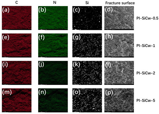 To observe the distribution of each element inside the samples, element mapping analysis was employed (Figure 4). C, N, and Si elements were all present in the PI-SiCw nanocomposites with different contents. Elements of C and N were relatively uniformly distributed, but the distribution of Si elements changed with the addition of various amounts of SiCw. From Figure 4o, it is obvious that irregular aggregation of SiCw occurred. The agglomeration of the whiskers reduces the bonding force, thus decreasing the mechanical properties.