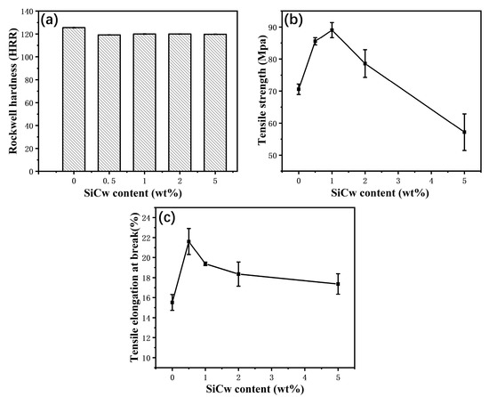 Figure 5a presents the hardness of PI-SiCw nanocomposites with various amounts of added SiCw. The results suggest that both PI-SiCw nanocomposites and PI had high hardness around 120 HRR. This implies that PI- SiCw nanocomposites can still maintain high hardness in the range of a small amount of added SiCw. Figure 5b,c shows the curves of tensile strength and tensile elongation at break PI-SiCw nanocomposites with different amounts of added SiCw. The tensile strength curve of PI-SiCw shows a trend of increasing first and then decreasing. When the addition of SiCw was 1%, the tensile strength of PI-SiCw reached the maximum value (89.05 MPa), which was 26% higher than that of the matrix. Tensile elongation at the break of PI-SiCw rose by 39% from 15.52% for the matrix to 21.61% for PI-SiCw-0.5. However, when the SiCw content exceeded 1%, the tensile strength and tensile elongation at the break of PI-SiCw showed an obvious decline. Due to the extremely high plasticity and mechanical strength of SiCw, the tensile strength and tensile elongation at break were enhanced as a whole [27], which can withstand greater external tensile force.