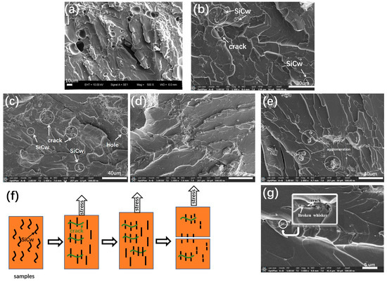 SEM images of tensile fracture surfaces of (a) PI and PI-SiCw nanocomposites: (b) PI-SiCw-0.5, (c) PI-SiCw-1, (d) PI-SiCw-2, (e) PI-SiCw-5. (f) Tensile resistance mechanism. (g) SEM images of broken whisker.