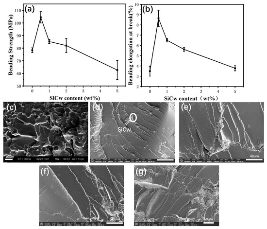 (a) Bending strength of PI and PI-SiCw nanocomposites (b) Bending elongation at break figures of PI and PI-SiCw nanocomposites. SEM images of bending fracture surfaces of (c) PI and PI-SiCw nanocomposites: (d) PI-SiCw-0.5, (e) PI-SiCw-1, (f) PI-SiCw-2, (g) PI-SiCw-5.