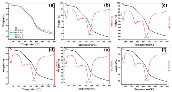 The thermal stabilities of PI-SiCw nanocomposites were observed by TGA and DTG (Figure 9a–f). The results of loss rate measurements of PI-SiCw nanocomposites from 30 °C to 800 °C are shown in Figure 9a. DTG curves of PI-SiCw nanocomposites (Figure 9b–f) were derivatives of the thermogravimetric curves. Overall, the residual weight of PI-SiCw nanocomposites was larger than that of the matrix, which increased from 44% to 49%. Moreover, the mass loss rate of PI-SiCw nanocomposites was fast around 65 °C and 450 °C. In the process of heating, the mass loss detected by TGA ranging from 50 °C to 100 °C may be due to the evaporation of water and some latent decomposition of polymer composites by heating [37]. The reaction process was divided into two stages. Due to the opening of the internal functional groups of the material molecules under a temperature higher than 400 °C, the hydroxyl content was drastically reduced, thereby decreasing the weight of the material at a rapid rate. The weight loss trend continued to be gentle till 500 °C on account of the carbonization of the samples. In comparison to the matrix, PI-SiCw nanocomposites possessed a high residual weight percentage. For example, when the temperature was 500 °C, the residual mass fraction of the matrix was only 56.7%, while the residual mass fractions of PI-SiCw-0.5, PI-SiCw-1, PI-SiCw-2, and PI-SiCw-5 were 57.9%, 58.2%, 59.1%, and 60.3%, respectively. With the increase in SiCw, the residual mass of SiCw nanocomposites was higher than that of the matrix till 800 °C. It can be seen from the changes in the heat loss of PI-SiCw nanocomposites that the addition of SiCw can improve the thermal stability of nanocomposites. As shown in Figure 9b–f, the maximum decomposition rate temperature (Tmax) remained high as a whole. Interestingly, with the increase in SiCw content, the decomposition temperature at 50% weight loss (T50%) of PI-SiCw showed a more obvious upward trend. This also showed that the thermal stabilities of PI-SiCw were better than that of the matrix. The results implied that SiCw can increase the volume owing to high thermal conductivities, so the interfacial thermal resistance between the matrix and SiCw decreased, thereby improving the thermal stabilities of PI-SiCw nanocomposites [38,39] (Table 2).