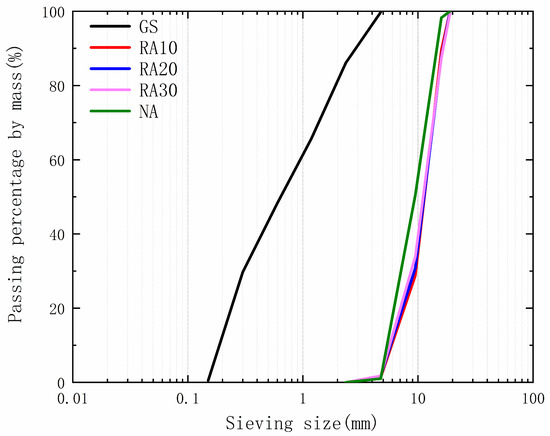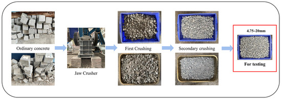 The recycled aggregates used in this study were laboratory-prepared ordinary concrete. After 28 days of curing, the compressive strengths of these ordinary concretes were 32.6 MPa, 25.5 MPa, and 19.7 MPa, respectively, and were designated as C30, C20, and C10, respectively. After the curing period, the concrete was crushed, sieved, cleaned, and air-dried to obtain the recycled aggregates. The recycled aggregates prepared from the concrete were designated as RA30, RA20, and RA10, respectively. The resulting aggregates were then separated into two size ranges of 4.75–10 mm and 10–20 mm for further modification and physical property testing. The production process of the recycled aggregates is illustrated in Figure 3. The physical properties of the recycled aggregates are presented in Figure 1 and Table 2.