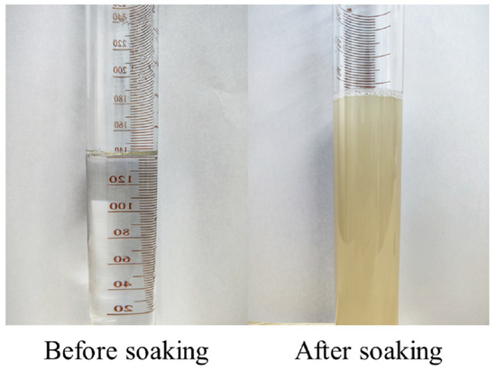 The water absorption test was carried out in accordance with the standard test for pebble and crushed stone used in construction (GB-T14685-2011). To avoid any potential damage to the internal structure of the recycled aggregate due to high-temperature drying and to minimize experimental error, the water absorption of the aggregate was tested using the natural air-drying method for 72 h. After the test, the samples of recycled and modified recycled aggregates were discarded directly to reduce the error caused by sampling pairs.