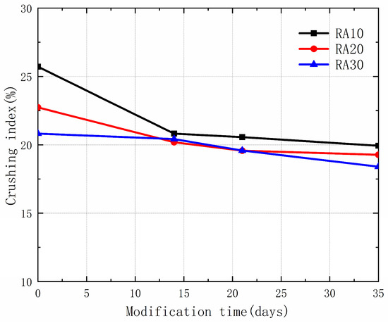 The crushing index is a crucial parameter for evaluating the mechanical performance of aggregates. The effect of permeable crystalline materials on the crushing index of recycled aggregates was investigated in this study. Figure 5 shows the crushing index of all modified recycled aggregates. The results indicate that the crushing index of recycled aggregates decreased after modification with permeable crystalline materials. Further analysis showed that the greatest decrease in the crushing index of the three types of aggregates occurred when the modification time was 35 days (22.45% decrease), followed by 21 days (20.00% decrease), and then 14 days (18.99% decrease). This suggests that the improvement effect on the crushing index of recycled aggregates becomes better with longer modification time. The permeable crystalline materials infiltrate into the pores of the recycled aggregates along with water, reacting with strongly oxidized calcium to produce crystalline compounds, thereby enhancing the strength of the recycled aggregates [29]. However, it should be noted that the efficiency of improving the crushing index of recycled aggregates decreases as the initial strength of the recycled aggregates increases. Therefore, for recycled aggregates with high initial strength, alternative approaches should be considered to modify their aggregate properties.
