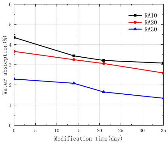 Water absorption is an important parameter for evaluating the quality of recycled aggregates, as it can affect the durability and long-term performance of concrete. Figure 6 shows the water absorption of different types of recycled aggregates under different modification times using permeable crystalline materials. The results indicate that the water absorption of the recycled aggregates decreased after modification, with the improvement becoming more significant with longer modification times. The maximum reduction in water absorption occurred after 35 days of modification, with a decrease of 41.48%, followed by 27.95% after 21 days of modification, and 20.92% after 14 days of modification. The reduction in water absorption can be attributed to the permeation of silicate materials from the permeable crystalline materials into the micro-cracks and voids of the old mortar, where it reacts with calcium hydroxide to generate C-S-H crystals that block the capillary channels. In addition, the silicate in the permeable crystalline materials adsorbs into the micropores of the old mortar, filling some of the pores and reducing the porosity [30,31]. The combined effect of these two factors leads to a decrease in water absorption of the recycled aggregates after modification, and an improvement in their performance.