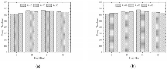 Recycled aggregate concrete slump flow: (a) 50% recycled aggregate replacement rate; (b) 100% recycled aggregate replacement rate.