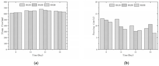 Recycled aggregate concrete V-funnel test time: (a) 50% recycled aggregate replacement rate; (b) 100% recycled aggregate replacement rate.