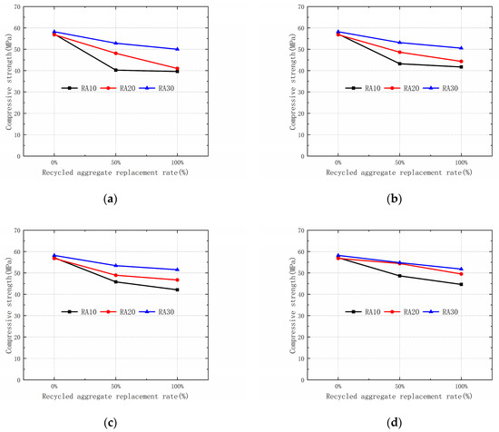 Compressive strengths of different replacement aggregate rates: (a) 0 day; (b) 14 day; (c) 21 day; (d) 35 day.