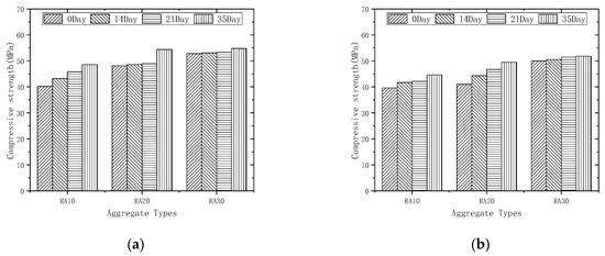 Compressive strengths of different aggregate initial strengths: (a) 50% recycled aggregate replacement rate; (b) 100% recycled aggregate replacement rate.