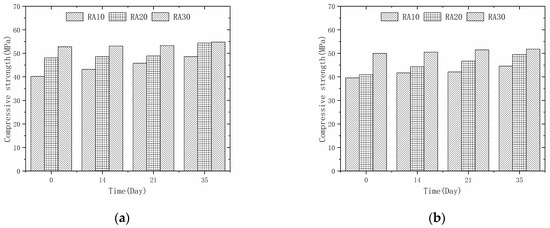 Compressive strengths of different modification times: (a) 50% recycled aggregate replacement rate; (b) 100% recycled aggregate replacement rate.