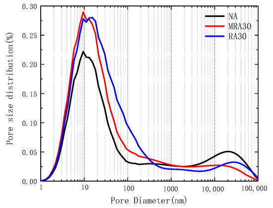 Figure 12 illustrates the pore distribution of three types of concrete. The figure demonstrates that all three types of concrete display a significant increase and decrease between 1 nm and 100 nm, with peaks in their distributions, indicating that the primary pore size distribution of the three types of concrete falls within the 1–100 nm range. The order of the distribution peaks observed was natural aggregate concrete, enhanced recycled aggregate concrete, and recycled aggregate concrete, with the peak pore size increasing in that order. This suggests that the pore size distribution of concrete decreases after reinforcing with permeable crystalline materials. Once the peak is achieved, the distribution rate of pores in enhanced recycled aggregate concrete slows down as the pore size increases. This implies that the pore size distribution in the reinforced recycled aggregate concrete is more uniform, and the average pore size is reduced after reinforcing with permeable crystalline materials.