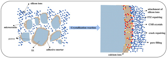 The performance of recycled aggregate concrete (RAC) can be improved by modifying it with infiltrating crystallization material, as depicted in the mechanism diagram: